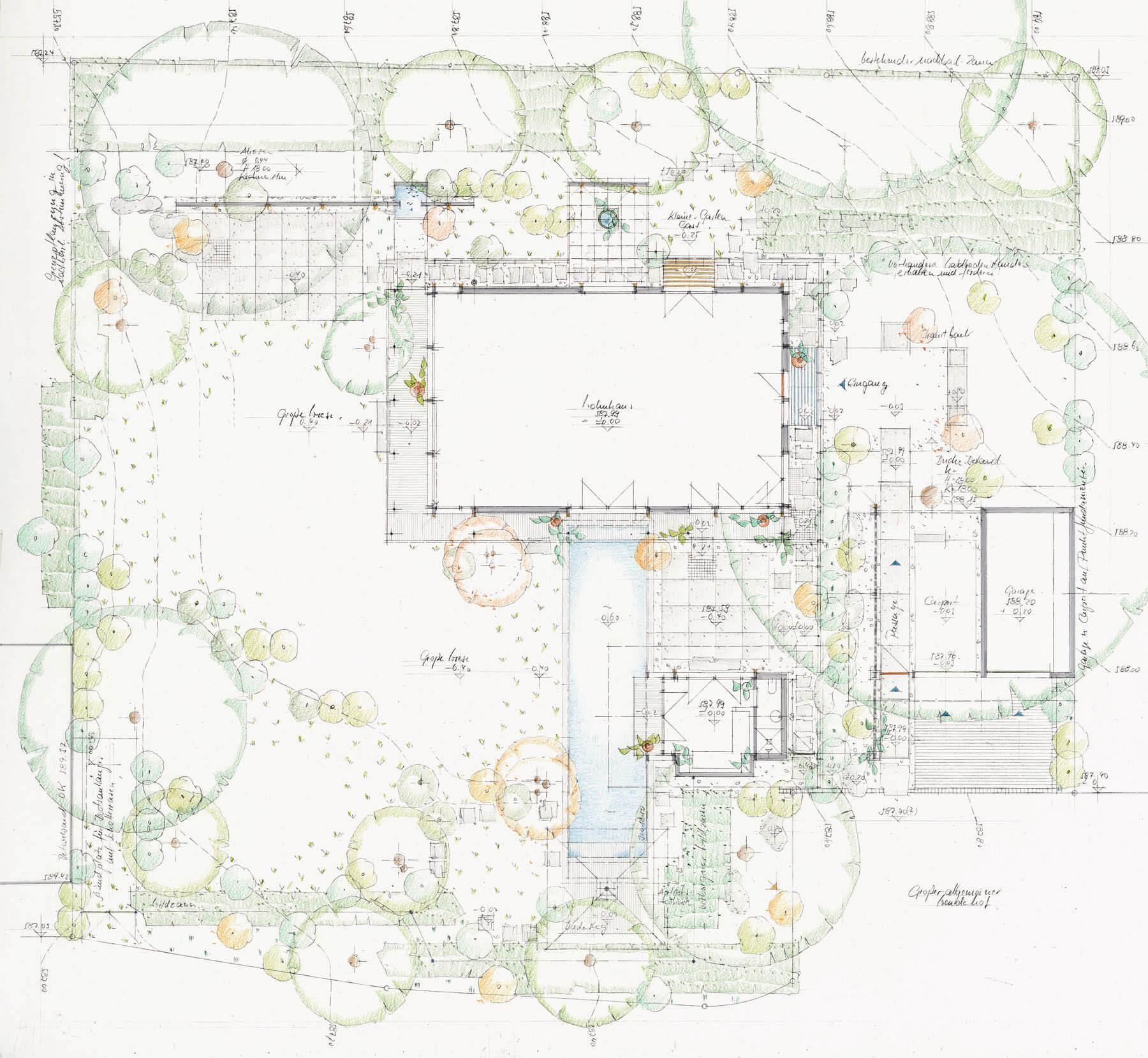 From the outset, the planning goal was to create a separate small house for guests, complete with a shower and kitchenette. The main house and guest house were grouped with the entrance building and garage to create distinct and varied outdoor spaces. Our plans show a grand forecourt, an entrance courtyard, and an atrium-like, very sheltered garden courtyard.